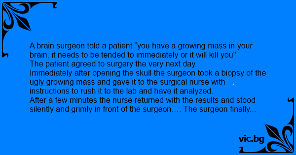 After a few minutes the nurse returned with the results and stood silently and grimly in front of the surgeon…. The surgeon finally asked…."WELL IS IT MALIGNANT?"