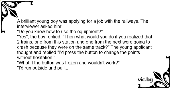 "Yes", the boy replied. "Then what would you do if you realized that 2 trains, one from this station and one from the next were going to crash because they were on the same track?" The young applicant thought and replied "I'd press the button to change the points without hesitation."