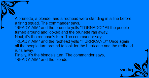 A brunette, a blonde, and a redhead were standing in a line before a firing squad. The commander says,