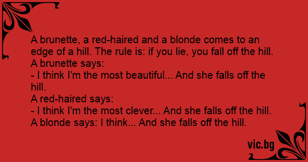 A brunette, a red-haired and a blonde comes to an edge of a hill. The rule is: if you lie, you fall off the hill.
