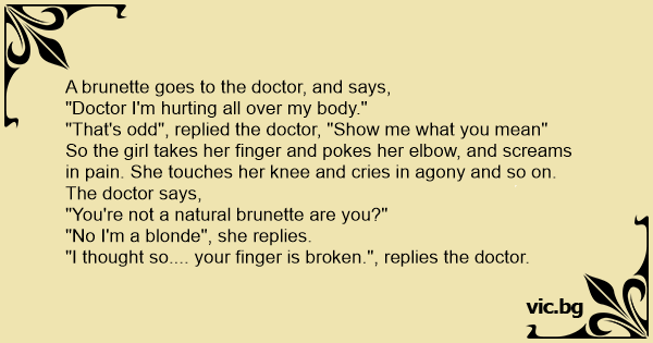 A brunette goes to the doctor and as she touches each part of her body with her finger she says, "Doctor it hurts everywhere. My leg hurts, my arm hurts, my neck hurts, and even my head hurts!" The...