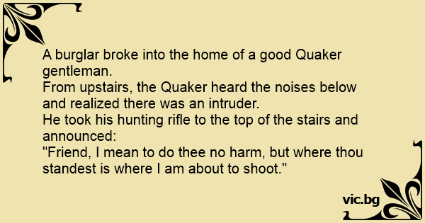From upstairs, the Quaker heard the noises below and realized there was an intruder.