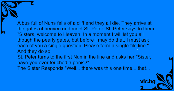 Přijdou čtyři jeptišky do nebe a u nebeské brány na ně čeká svatý Petr. Dříve než je pustí do nebe, ptá se první jeptišky, jestli se někdy dotkla pánského údu. Jeptiška odpoví, že jej pouze viděla....