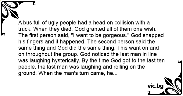 A bus full of ugly people had a head on collision with a truck. When they died, God granted all of them one wish.
