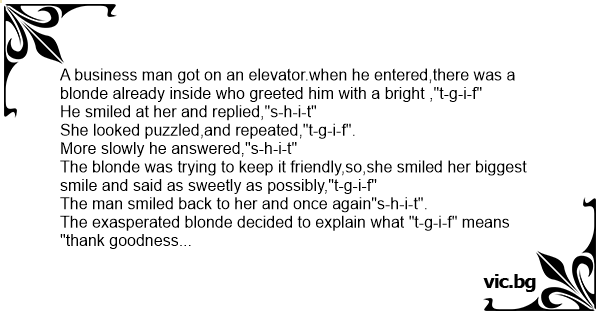 A business man got on an elevator.when he entered,there was a blonde already inside who greeted him with a bright ,"t-g-i-f"