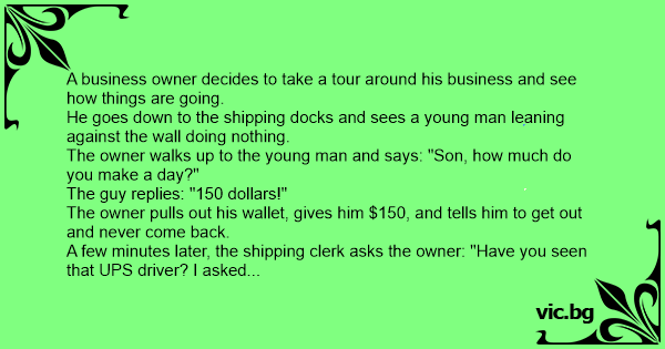 A few minutes later, the shipping clerk asks the owner: "Have you seen that UPS driver? I asked him to wait here for me!"