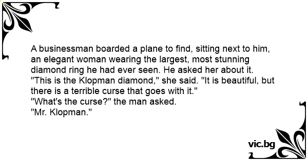 Млад бизнесмен се качва на самолет, и вижда, че до него седи, млада, елегантна жена, носеща най-големия, най-зашеметяващия диамантен пръстен, който някога е виждал. - Хубав диамант - казва той. -...