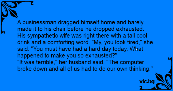 His sympathetic wife was right there with a tall cool drink and a comforting word. "My, you look tired," she said. "You must have had a hard day today. What happened to make you so exhausted?"