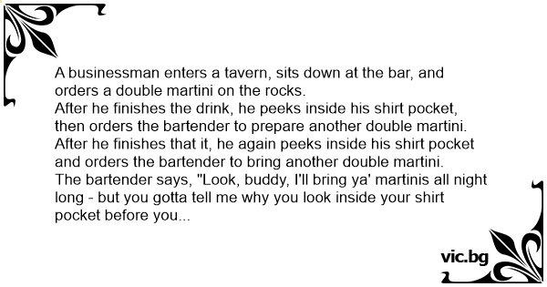 A businessman enters a tavern, sits down at the bar, and orders a double martini on the rocks.