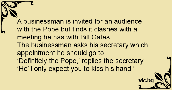 A businessman is invited for an audience with the Pope but finds it clashes with a meeting he has with Bill Gates.