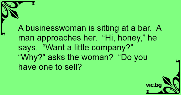 A businesswoman is sitting at a bar. A man approaches her. “Hi, honey,” he says. “Want a little company?”