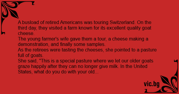 A busload of retired Americans was touring Switzerland. On the third day, they visited a farm known for its excellent quality goat cheese.