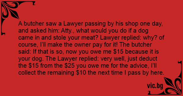 A butcher saw a Lawyer passing by his shop one day, and asked him: Atty., what would you do if a dog came in and stole your meat? Lawyer replied: why? of course, I’ll make the owner pay for it! The butcher said: If that is so, now you owe me $15 because it is your dog. The Lawyer replied: very well, just deduct the $15 from the $25 you owe me for the advice, I’ll collect the remaining $10 the next time I pass by here.