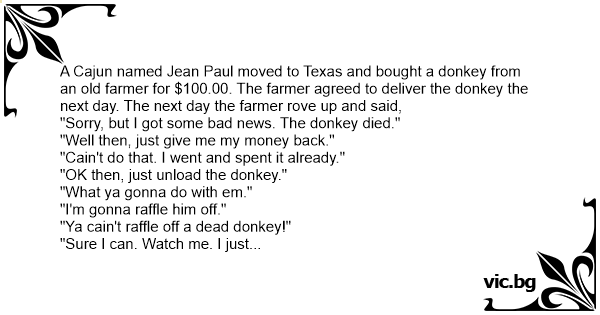 "Sure I can. Watch me. I just won't tell anyone he's dead."A month later the farmer met up with the Cajun and asked, "What happened with the dead donkey?"