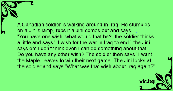 "You have one wish, what would that be?" the soldier thinks a little and says " I wish for the war in Iraq to end". the Jini says em i don't think even i can do something about that. Do you have any other wish? The soldier then says "I want the Maple Leaves to win their next game" The Jini looks at the soldier and says "What was that wish about Iraq again?"