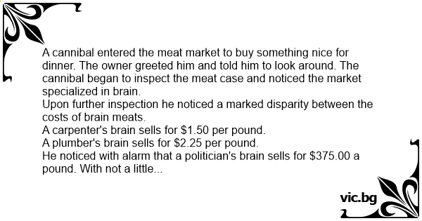 He noticed with alarm that a politician's brain sells for $375.00 a pound. With not a little curiosity he asked the owner why the huge difference in price between the similar meats.