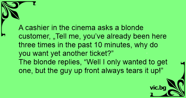 Jednog dana dođe plavuša u kino. Dođe kod blagajnika i kupi kartu, nakon 2 minute vrati se prodavaču i opet kupi kartu. Kad ono se ona opet vratila te je kupila još nekoliko karata. Nakon petog...
