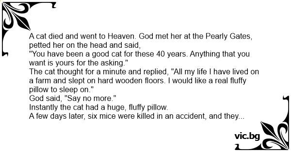 A cat died and went to Heaven. God met her at the Pearly Gates, petted her on the head and said,