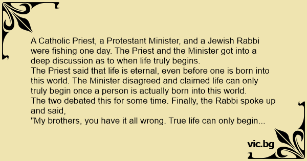A Catholic Priest, a Protestant Minister, and a Jewish Rabbi were fishing one day. The Priest and the Minister got into a deep discussion as to when life truly begins.