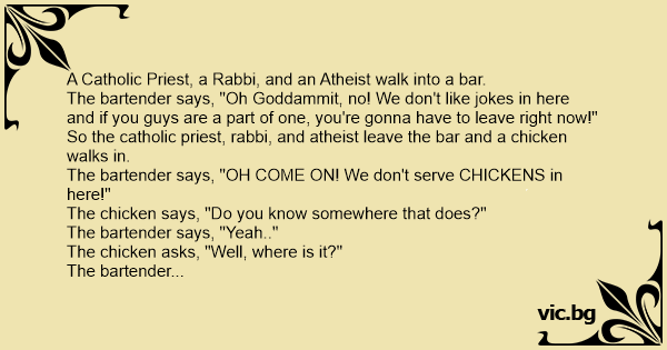 The bartender says, "Oh Gоddаммiт, no! We don't like jokes in here and if you guys are a part of one, you're gonna have to leave right now!" So the catholic priest, rabbi, and atheist leave the bar and a chicken walks in.