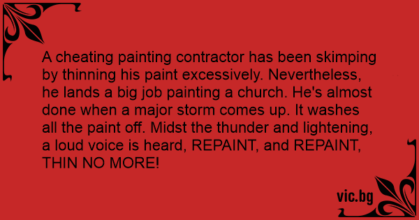 A cheating painting contractor has been skimping by thinning his paint excessively. Nevertheless, he lands a big job painting a church. He's almost done when a major storm comes up. It washes all the paint off. Midst the thunder and lightening, a loud voice is heard, REPAINT, and REPAINT, THIN NO MORE!