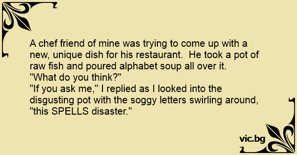 A chef friend of mine was trying to come up with a new, unique dish for his restaurant. He took a рот of raw fish and poured alphabet soup all over it.