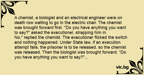 A chemist, a biologist and an electrical engineer were on death row waiting to go in the electric chair. The chemist was brought forward first. "Do you have anything you want to say?" asked the executioner, strapping him in.