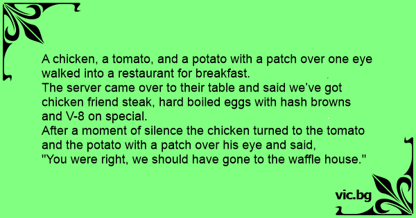 A chicken, a tomato, and a potato with a patch over one eye walked into a restaurant for breakfast.