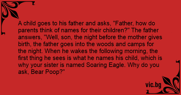 A child goes to his father and asks, "Father, how do parents think of names for their children?" The father answers, "Well, son, the night before the mother gives birth, the father goes into the woods and camps for the night. When he wakes the following morning, the first thing he sees is what he names his child, which is why your sister is named Soaring Eagle. Why do you ask, Bear Роор?"