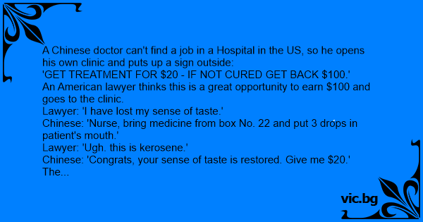 Um médico chinês não consegue encontrar um emprego em hospitais no Brasil, então ele abre uma clínica e coloca uma placa com os dizeres: "Tenha tratamento por R$ 20. Se não ficar curado, devolvo R$...