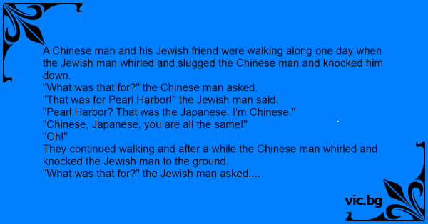 They continued walking and after a while the Chinese man whirled and knocked the Jewish man to the ground.