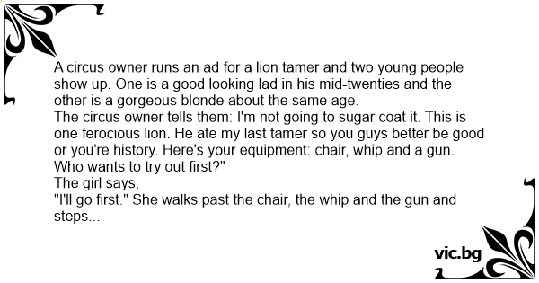 The circus owner tells them: I'm not going to sugar coat it. This is one ferocious lion. He ate my last tamer so you guys better be good or you're history. Here's your equipment: chair, whip and a gun. Who wants to try out first?"