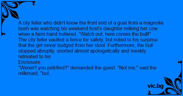 "Weren't you petrified?" demanded the guest. "Not me," said the milkmaid, "but I reckon the bull was. This here соw's his mother-in-law."