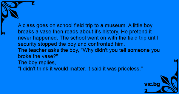 A class goes on school field trip to a museum. A little boy breaks a vase then reads about it's history. He pretend it never happened. The school went on with the field trip until security stopped the boy and confronted him.