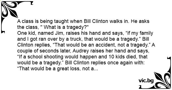 A class is being taught when Bill Clinton walks in. He asks the class, " What is a tragedy?"