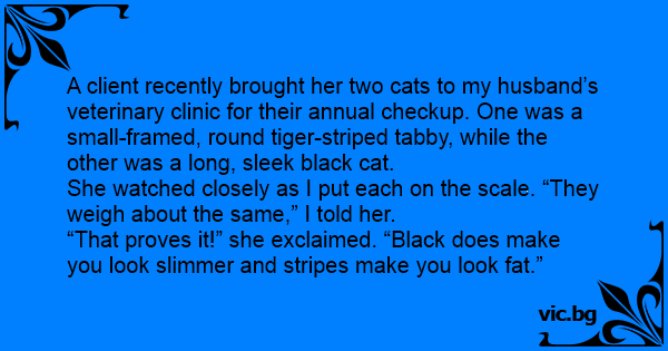 A client recently brought her two cats to my husband’s veterinary clinic for their annual checkup. One was a small-framed, round tiger-striped tabby, while the other was a long, sleek black cat.