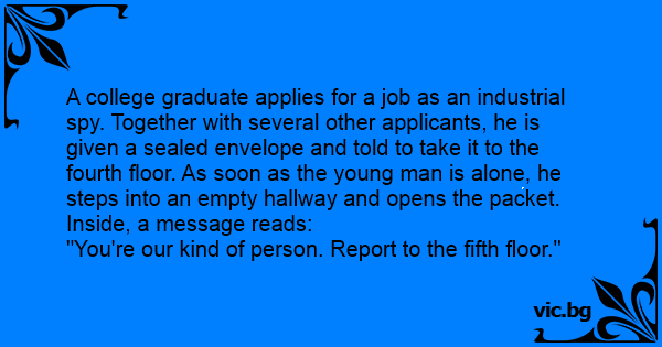 A college graduate applies for a job as an industrial spy. Together with several other applicants, he is given a sealed envelope and told to take it to the fourth floor. As soon as the young man is alone, he steps into an empty hallway and opens the packet. Inside, a message reads: