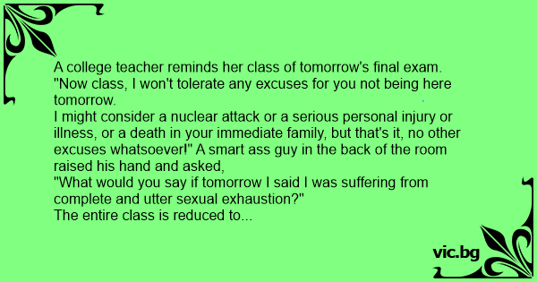 "Now class, I won't tolerate any excuses for you not being here tomorrow.