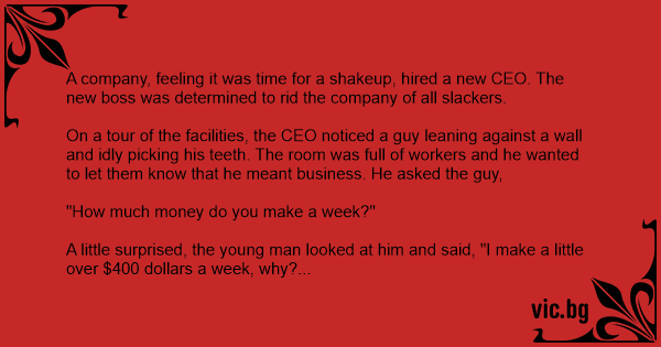 On a tour of the facilities, the CEO noticed a guy leaning against a wall and idly picking his teeth. The room was full of workers and he wanted to let them know that he meant business. He asked the guy,