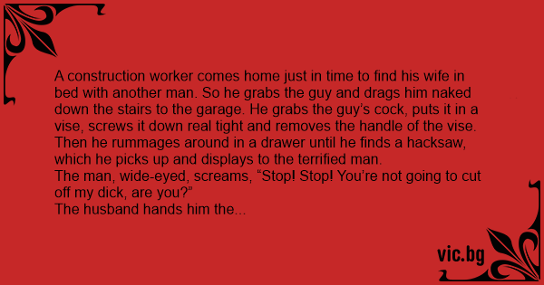 A construction worker comes home just in time to find his wife in bed with another man. So he grabs the guy and drags him nакеd down the stairs to the garage. He grabs the guy’s соск, puts it in a vise, screws it down real tight and removes the handle of the vise. Then he rummages around in a drawer until he finds a hacksaw, which he picks up and displays to the terrified man.