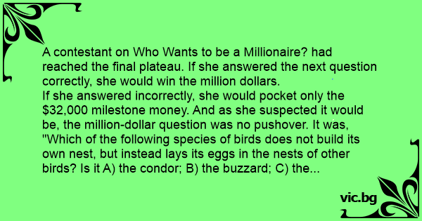 But the contestant had no alternative. She called her friend and gave her the question and the four choices. The blonde responded unhesitatingly: "That's easy. The answer is 'C' -- the cuckoo."
