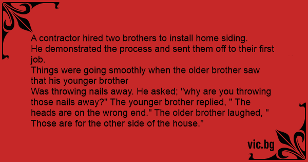Was throwing nails away. He asked; "why are you throwing those nails away?" The younger brother replied, " The heads are on the wrong end." The older brother laughed, " Those are for the other side of the house."