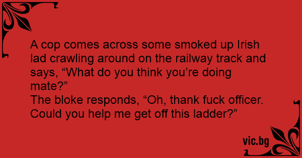 A cop comes across some smoked up Irish lad crawling around on the railway track and says, “What do you think you’re doing mate?”