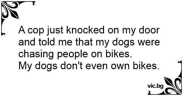 I was just told that my dog chased someone on a bicycle and bit him. That's bullshit, my dog can't even ride a bicycle.