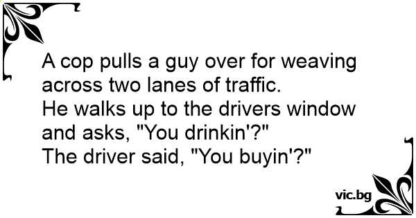 He walks up to the drivers window and asks, "You drinkin'?"