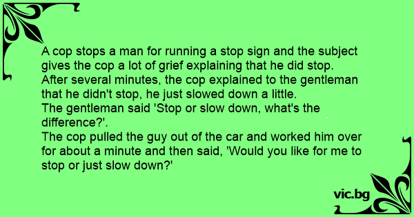 The gentleman said 'Stop or slow down, what's the difference?'.
