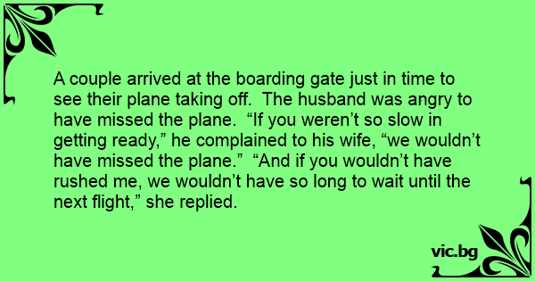 A couple arrived at the boarding gate just in time to see their plane taking off. The husband was angry to have missed the plane. “If you weren’t so slow in getting ready,” he complained to his wife, “we wouldn’t have missed the plane.” “And if you wouldn’t have rushed me, we wouldn’t have so long to wait until the next flight,” she replied.