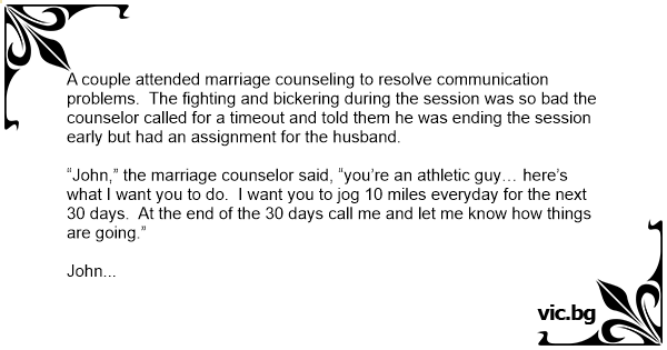 “John,” the marriage counselor said, “you’re an athletic guy… here’s what I want you to do. I want you to jog 10 miles everyday for the next 30 days. At the end of the 30 days call me and let me know how things are going.”