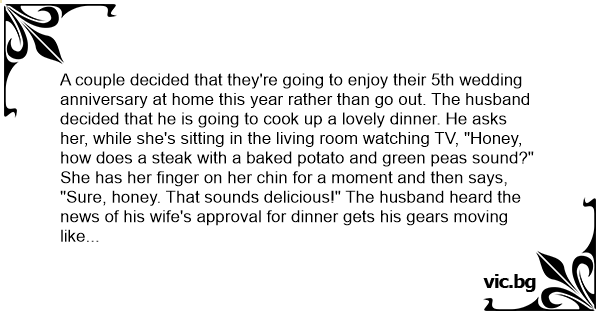 A couple decided that they're going to enjoy their 5th wedding anniversary at home this year rather than go out. The husband decided that he is going to cook up a lovely dinner. He asks her, while she's sitting in the living room watching TV, "Honey, how does a steak with a baked potato and green peas sound?" She has her finger on her сhin for a moment and then says,