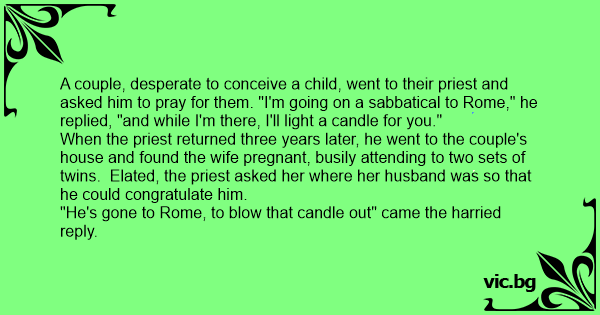 A couple, desperate to conceive a child, went to their priest and asked him to pray for them. "I'm going on a sabbatical to Rome," he replied, "and while I'm there, I'll light a candle for you."